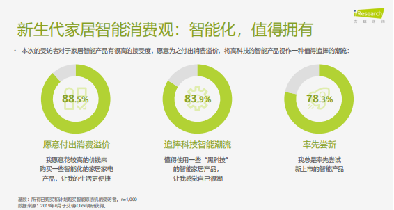 新生代家居智能消費(fèi)觀會更偏向智能化,本次的受訪者對于家居智能產(chǎn)品有很高的接受度,愿意為之付出消費(fèi)溢價,將高科技的智能產(chǎn)品視作一種值得追捧的潮流。