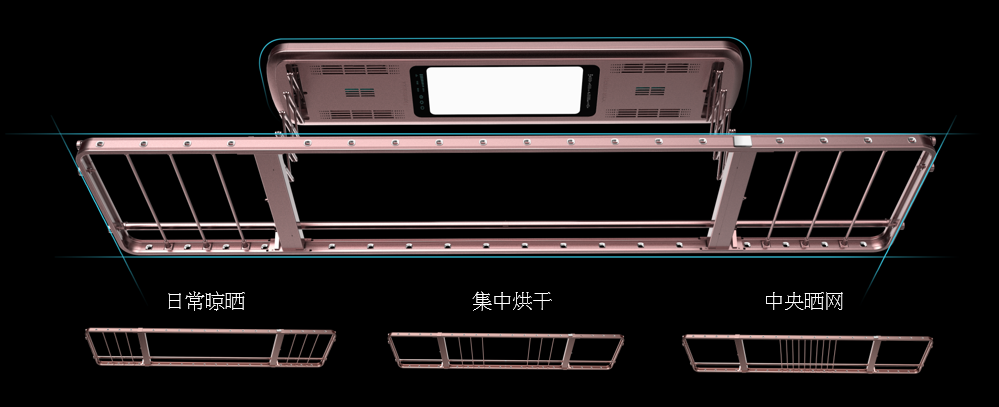 一體化全面屏,集成照明、隱藏消毒、VLED雙屏顯示。雙層加強環(huán)形晾桿,多種組合方式,讓晾曬更便捷。