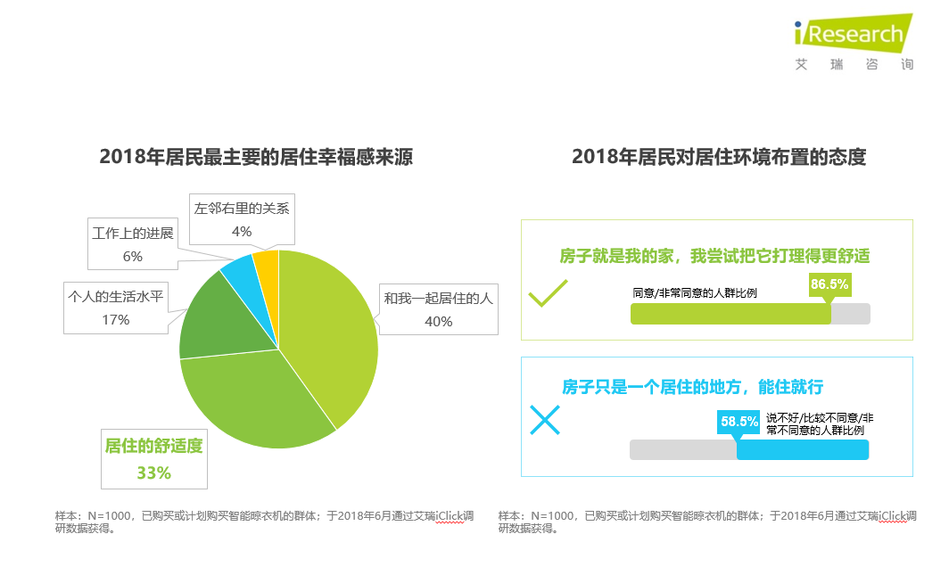 居民對居住舒適度的重視度和要求較高,33%的居民認為居住的舒適度是最主要的幸福感來源,86.5%的居民同意或非常同意“房子就是我的家,我嘗試把它打理得更舒適”這一觀點,而對“房子只是一個居住的地方,能住就行”這一觀點,不認同或說不好的人群比例達58.5%。