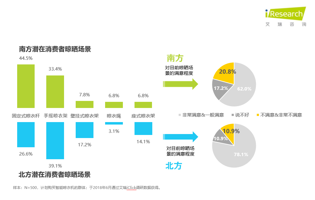 通過對計劃購買智能晾衣機的潛在消費者進行調研,南方消費者目前主要采用的晾曬工具是固定式晾衣桿,其次為手搖晾衣機,20.8%的消費者對目前晾曬場景不滿意或非常不滿意,17.2%持中立態(tài)度。北方消費者主要采用的晾曬工具是手搖晾衣機,10.9%的消費者表示不滿意目前的晾曬場景。