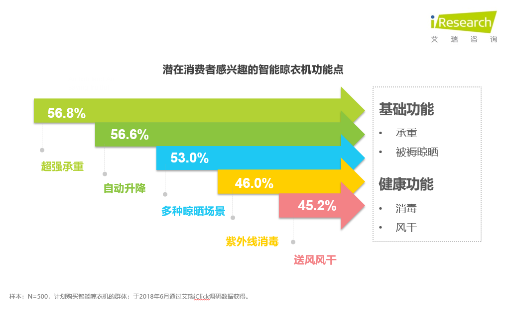 對于暫未購買的消費者來說,對智能晾衣機超強承重、自動升降和多種晾曬場景等傳統(tǒng)基礎上的升級點非常關注,同時超出40%的群體對創(chuàng)新型的健康保護功能,如紫外線消毒和送風風干等表示關注。