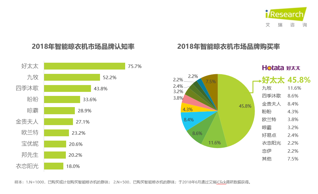 購買過智能晾衣機的用戶中,好太太的品牌知曉率高達75.7%,購買率45.8%,智能晾衣機市場品牌化表現(xiàn)突出。