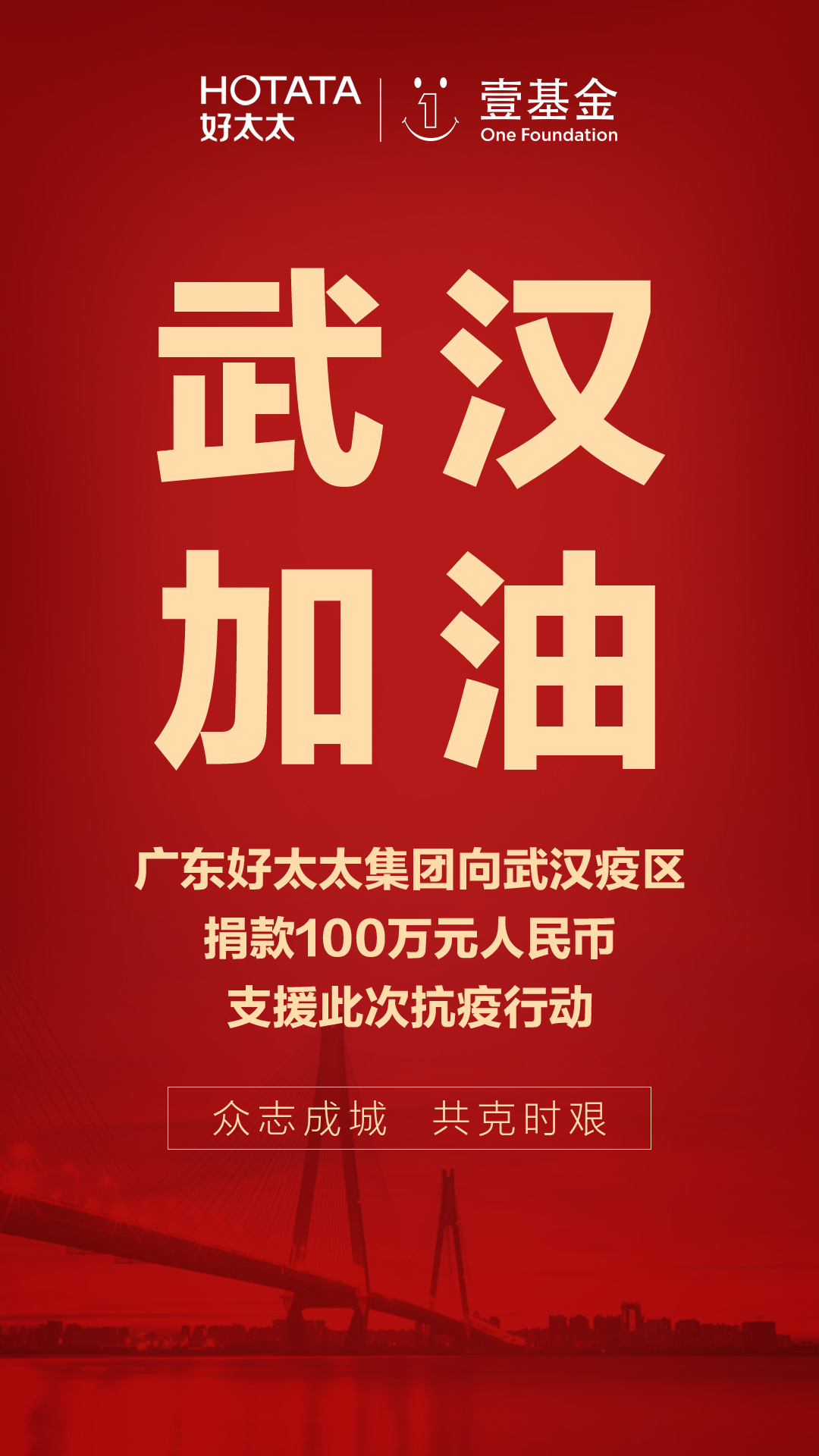 好太太集團(tuán)攜手壹基金馳援武漢捐款100萬用于抗疫行動,援助湖北抗擊新型冠狀病毒,百萬抗疫物資即將發(fā)往疫區(qū),愿疫情早日結(jié)束。