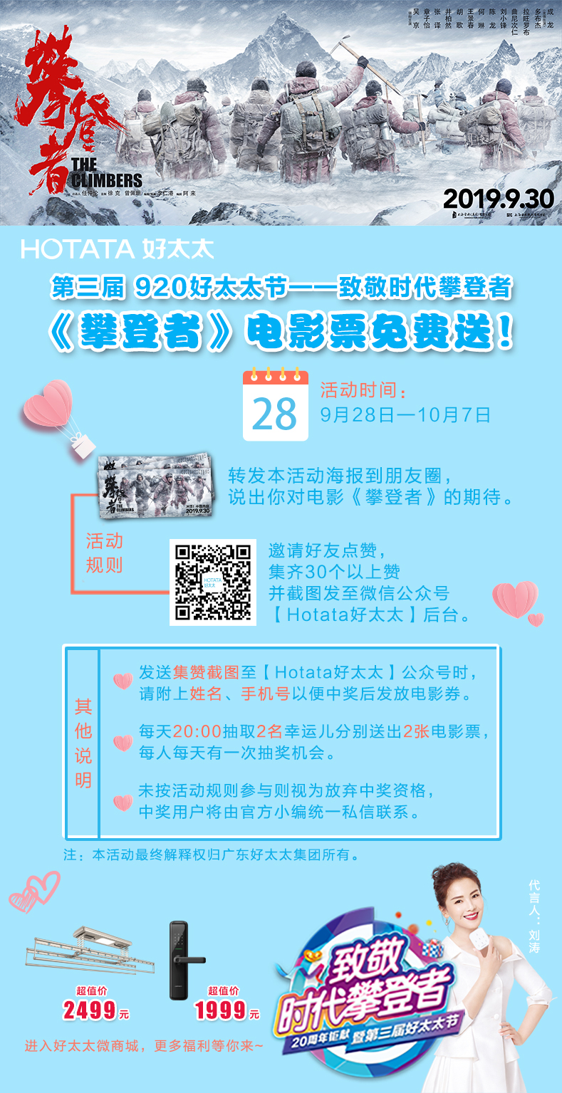 微信關(guān)注官方公眾號(hào)【Hotata好太太】,回復(fù)“電影票”,即獲得電影《攀登者》送票攻略。