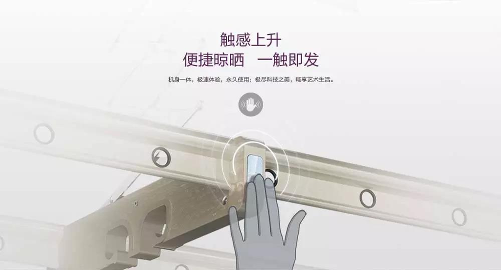 突破傳統(tǒng)的按鍵控制,手指輕輕一觸,即可實現(xiàn)上升功能,在行業(yè)首次應用V-LED顯示,實時顯示晾曬狀態(tài),將智慧化的晾曬體驗發(fā)揮到極致。