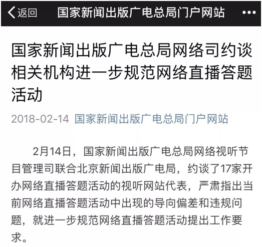 2 月(yuè) 14 日,广(guǎng)电总局发(fā)出通知,要求对(duì)网(wǎng)络视听直播(bō)答题活(huó)动加强管理,进一(yī)步(bù)规(guī)范网上(shàng)传播秩序,防范社(shè)会(huì)风险。