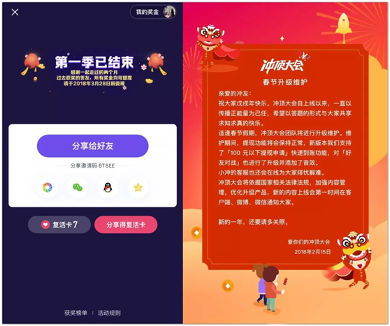 这则通知的(de)发出,基本给大部分(fèn)做直(zhí)播答(dá)题的平(píng)台判了“死刑(xíng)”。原计划在年后结束(shù)的百万英(yīng)雄、百万(wàn)赢家、黄金十秒等节(jiē)目先后提前宣告第一(yī)季结束,其他诸如冲顶大会、网(wǎng)易大(dà)赢家、爱乐之战等也贴出了系统维护升级的字样。