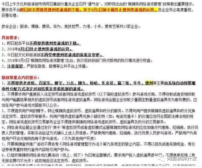 上(shàng)月有消息传(chuán)出,文化和旅游部(bù)召集(jí)了新浪、博雅、竞技世界、力港等(děng)15家重点(diǎn)企业开了“通(tōng)气(qì)会”,对(duì)于“棋牌类网络游戏管理”政策做了重要提(tí)示,要求各平(píng)台即日起不得提供(gòng)德州游戏的下载,并于6月1日前(qián)全面终(zhōng)止德州类(lèi)游戏(xì)的运营(yíng)。会议(yì)具体指示如下: