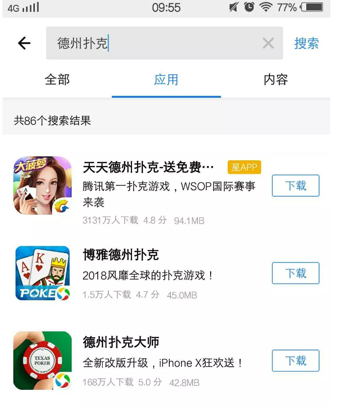 在安卓最大的应用分发平台(tái)应用宝(bǎo)上,目前能搜(sōu)索到的德州扑克游戏,也有86个。