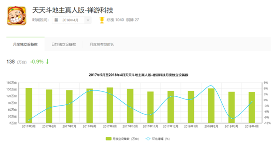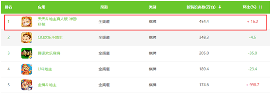 其旗下(xià)主打产品《天天斗地主真人版》,4月新装设备(bèi)数高达454.4万台,击败了《欢乐(lè)斗地(dì)主》、《欢(huān)乐麻(má)将(jiāng)》等一系(xì)列腾讯旗下(xià)产品,荣登榜(bǎng)首。