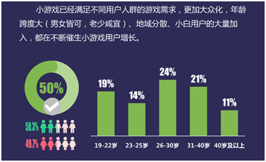 白皮书中,对(duì)小游戏的特点也进行(háng)了(le)概括,即点击即玩、可社交传播、碎片化(huà)时间和轻(qīng)松休闲(xián)四大特点,同时(shí),还对小游戏(xì)用户进行了分析。由于门槛(kǎn)较低,小(xiǎo)游戏的玩家群体(tǐ)覆盖范围广(guǎng),呈(chéng)现出年龄跨度大、男女比例均衡(héng)、地域分布(bù)广的特点。