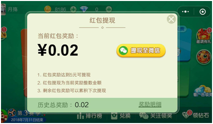 在红(hóng)包(bāo)场(chǎng)中,进入(rù)游戏的(de)标准也与此相关,除了要使用钻石报名入场,游(yóu)戏身份(fèn)也(yě)是要(yào)求(qiú)之一。此外(wài),玩家在金币桌对局时,达到指定局数,也可获(huò)得红包奖(jiǎng)励。而当红包(bāo)达到一定金(jīn)额(é)以后,游戏中还为(wéi)玩家提供了兑换入口,可将(jiāng)红包(bāo)提现(xiàn)至微信。各(gè)个部分(fèn)的游戏(xì)设置相(xiàng)互关联,也有利于增加用户的粘性和活跃度。