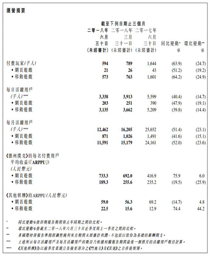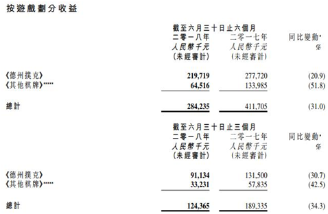 但从(cóng)博(bó)雅旗(qí)下的棋牌游戏业(yè)务(wù)来看(kàn),今(jīn)年在国内被(bèi)禁(jìn)的(de)《德州扑克(kè)》,上半年营收约(yuē)为2.2亿元,同比下降了20.9%。可(kě)是,即便如(rú)此,它也是占了上半年(nián)总营收的(de)绝(jué)大部(bù)分。从棋(qí)牌游戏业务的(de)营收表现来(lái)看,博(bó)雅旗下棋牌游戏几乎是公(gōng)司(sī)全部的收入来(lái)源。上半(bàn)年棋牌监管政策收紧(jǐn)以(yǐ)后,对博雅打击巨大。公告中同时也对营收下(xià)降作出解释(shì):主要由于政策问题和苹果审核(hé)等(děng)因(yīn)素共同影响所致。
