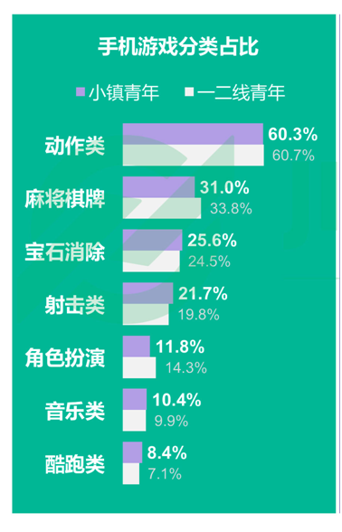 此外,随着(zhe)智能手机的普及,线上棋牌游戏几乎可以触及到(dào)每(měi)一个潜在的(de)游戏用户。而根据(jù)极(jí)光大数据推出的《2018年8月(yuè)小镇青年(nián)消费研究报告》中指出,除了动作类游戏以外,不管是一二线城市(shì)青年还是小镇青年,麻将(jiāng)棋牌游戏在他们手机游戏分(fèn)类(lèi)中的占(zhàn)比(bǐ)都是最(zuì)多的(de)。