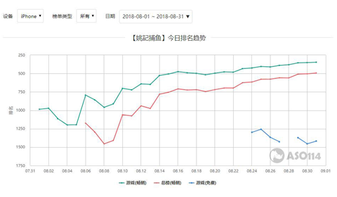 从(cóng)苹果的游戏(xì)排行榜(bǎng)变(biàn)化趋势上,也(yě)可以发现,8月(yuè)份《姚记捕鱼》的总排名(míng)都是呈(chéng)稳(wěn)定上升的趋(qū)势,在APP总榜和游戏类畅销榜上,增幅(fú)均超(chāo)过500名。而从艾瑞咨询(xún)提供(gòng)的具体的月活变(biàn)化数据来看,8月《姚(yáo)记捕鱼》的月活(huó)和上月相比,增加了约5万台。