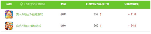 斗(dòu)地主(zhǔ)是(shì)它的主要产品,从8月的(de)表现来看,它的《真(zhēn)人斗地主(zhǔ)2—蛙蛙游戏》和《欢乐斗地(dì)主—蛙蛙游戏》月活均(jun1)有(yǒu)所增长。