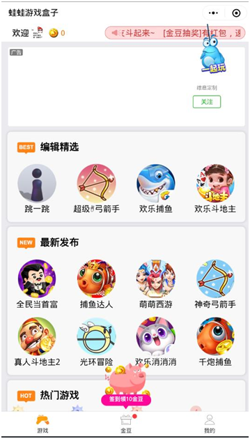 同时,玩家通(tōng)过点击小游戏,还可跳转至“蛙蛙(wā)游戏盒子”,其中有多款(kuǎn)休闲游戏(xì)可供选择,以此来实现用户留存和再次转化。