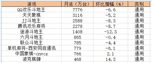 而(ér)根据通用棋牌月活排(pái)名前十的(de)游戏数据(jù)显示,9月份通用(yòng)棋牌(pái)月活几乎整体呈下降(jiàng)趋势(shì),腾讯、JJ、途游等旗下(xià)多款棋牌游戏下降幅度较大,《途游(yóu)斗(dòu)地主》的月活下降幅度(dù)达到了12.3%。不过,相比较之下,《中国象棋-cnvcs》和(hé)《波(bō)克棋牌》表现不错,其中《波(bō)克棋牌》的增幅也达到了两位数。