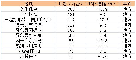 而(ér)9月份(fèn)地方棋牌的表现则有些出人意料,在地方棋牌市场一直占据头把交椅的多乐,9月份的月活总量虽(suī)然仍排第一,但是和前几个月相比(bǐ),首次(cì)出现了下(xià)滑的趋势。而之前表现不佳的微乐(lè)和闲来,则(zé)在9月打了一(yī)场翻身仗(zhàng)。在9月(yuè)份地(dì)方棋(qí)牌月活排名前十(shí)榜单中,微乐旗下《微乐辽(liáo)宁棋牌》、《微乐贵阳(yáng)捉鸡》和《微乐家乡(xiāng)棋牌》共(gòng)三款(kuǎn)游戏上(shàng)榜,且都呈(chéng)增幅状态(tài)。闲来旗下《闲来广东麻将(jiāng)》和《熊猫四川麻(má)将(jiāng)》也在榜单之中,增幅均(jun1)超过10%。
