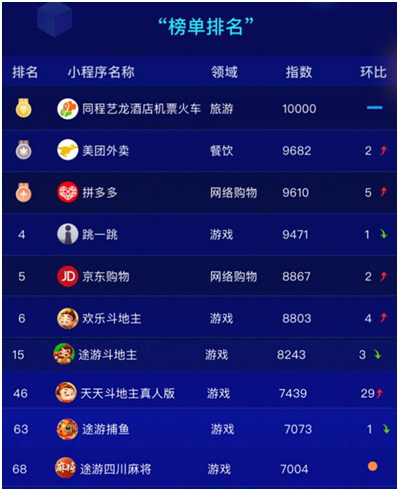 从(cóng)具体的榜(bǎng)单信息中大家可以看到,在排名(míng)前100的小程序(xù)上(shàng),棋牌游戏共(gòng)有5款游戏上榜,分别是腾讯旗下的(de)《欢乐(lè)斗地主(zhǔ)》、禅游(yóu)科技旗下的《天天斗地主真人(rén)版》和(hé)途游旗(qí)下的《途游斗地主》、《途游捕鱼(yú)》以及《途游四川麻将》。其中,《天天斗地主真人版》上升幅度最(zuì)大,而途游游戏排名出现了小幅度的下滑。