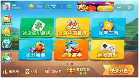不过,和其他(tā)棋牌类小游戏相比,途游旗下地方性(xìng)游戏《途(tú)游四川麻将》首次上榜,而且(qiě)在小程(chéng)序成长榜TOP50中,也作为唯一的一(yī)款棋牌游戏位列其中。从上榜的游戏大家也可以(yǐ)发现,不(bú)管(guǎn)是斗地(dì)主还是捕鱼(yú)游戏,它们的玩法(fǎ)都是通用(yòng)性质的,潜在用户群体较大,获(huò)客(kè)难(nán)度和地方性棋(qí)牌游戏相比也稍低一些(xiē)。在此情(qíng)况(kuàng)下(xià),《途游四川麻(má)将(jiāng)》强势上榜,又是如何做到的呢?