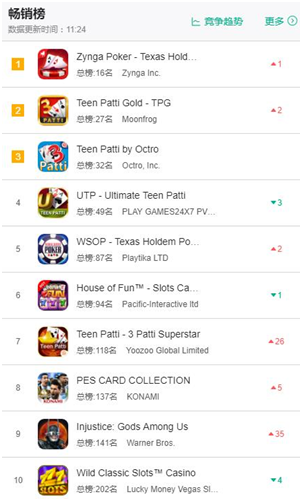 而在App Store上的印度地区卡牌类游戏(xì)畅销榜TOP10上(shàng),Teen Patti也占有较大比例。其中印度(dù)本土发(fā)行(háng)的(de)Teen Patti游戏,在排名中更(gèng)是具(jù)有绝对的优势。此外,就(jiù)是(shì)受到全球热(rè)捧的德州扑克(kè)游戏。而游族发(fā)行的(de)Teen