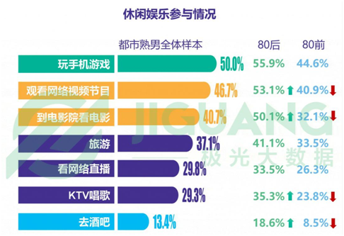 从休闲(xián)娱乐的参与情况来看,和(hé)其(qí)他休闲(xián)方(fāng)式相比,手游以50.0%的(de)占(zhàn)比成为(wéi)都市成熟男性的首(shǒu)要选(xuǎn)择(zé)。而(ér)从不同(tóng)的年龄分层来看(kàn),80后(hòu)的参与度显然更高,比(bǐ)80前(qián)男性高出了11.3个百分点。