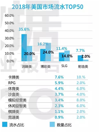 在(zài)全球(qiú)移动游戏市(shì)场位(wèi)列(liè)第二的美国,棋牌类游戏(xì)的流水和数量占(zhàn)比都不多。不过,这也(yě)和美国国内(nèi)市(shì)场(chǎng)的情况(kuàng)是有关联性的。此外,博彩类游戏(xì)在美国市(shì)场上占比较重,是(shì)除了消除类游戏以(yǐ)外,给营收带来主要贡(gòng)献的(de)游(yóu)戏类别。其中,它的流水在今年美国(guó)市场流水TOP50中占比达(dá)16.2%,游戏数量占比为24.0%。