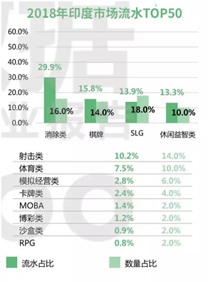 和美国(guó)市场类似,印(yìn)度(dù)的棋牌游戏在市场上所占份额(é)也较大。2018年,印(yìn)度的棋牌游戏流水在全年(nián)市场流水TOP50中占(zhàn)比为15.8%,游戏产品数量(liàng)占比为(wéi)14.0%。相比(bǐ)较而言,印度的博彩游戏则(zé)稍微逊色一些。不(bú)过需要注意的是,在印度棋牌游戏市场上,本土(tǔ)玩法的《Teen Patti》最受玩(wán)家欢(huān)迎,如果想要(yào)进军(jun1)印(yìn)度市场,不如以此为突破口。