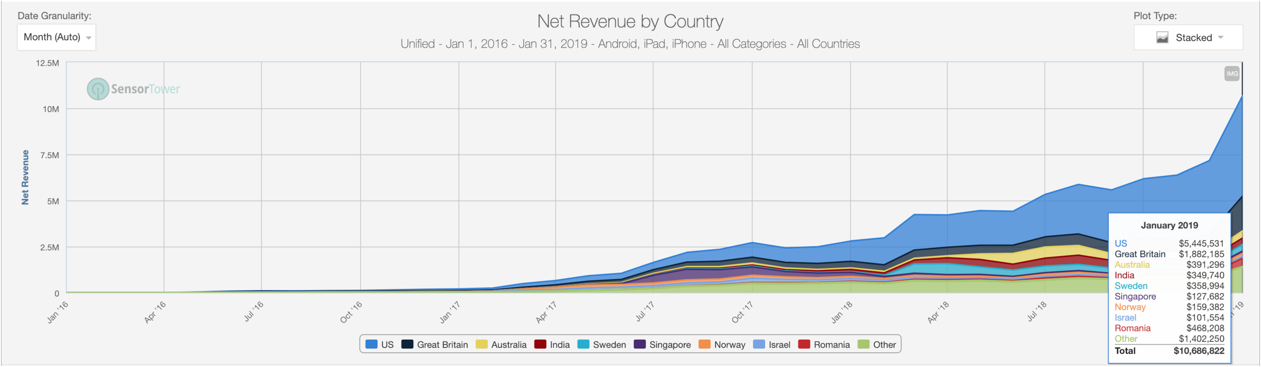 2016 年 1 月 - 2019 年 1 月(yuè)《金币大师》在安卓和苹果双平台的收入数据 | 来源:Sensor Tower