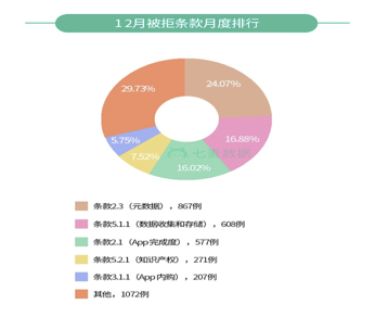 ①如(rú)下图所示,2017年12月(yuè),在统计的所有样(yàng)本数据中,条款2.3(元数据问(wèn)题)占据近乎(hū)四分之一(yī)的比(bǐ)例;其次是条(tiáo)款5.1.1(主(zhǔ)要是用户隐私问题),占比约16.88%;而条款2.1(主要(yào)是App完成度问题,此时被拒大礼包还没集(jí)中出现)以(yǐ)577例居(jū)第三。除此之外,Top5中还有5.2.1。