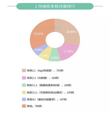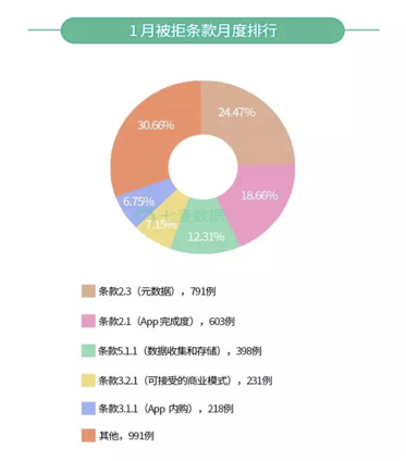 ②在2018年1月被拒条款排行中,条(tiáo)款2.3(元数(shù)据(jù))继续位居榜(bǎng)首,紧跟其后的是原本在2017年12月排在第二名的(de)条款2.1(App 完成度(dù))。而新(xīn)晋条款3.2.1以(yǐ)231例,7.15% 的(de)比例成为第四名。