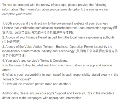 在因3.2.1被(bèi)拒的(de)App中(zhōng),很多人是收(shōu)到了下方的(de)内容,要(yào)求提供(gòng)营(yíng)业执照、金融许可证(zhèng)等7项内容。对于3.2.1,现在已经出现(xiàn)了待操(cāo)作(zuò)、过审,我简单说一下过审的App大体都做了啥吧!