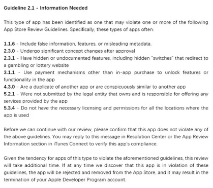 注(zhù):2.1刚出(chū)现的时,即使(shǐ)App有违规(guī)行为直(zhí)接(jiē)回复也是有可能过审的(de),但是目前有点用烂了(le),苹果(guǒ)那(nà)边应该是(shì)敏感了,目(mù)前过审(shěn)几率极低,而且(qiě)有可能被延期。