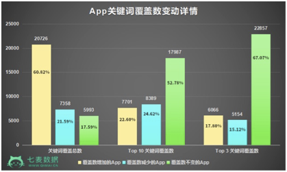 七(qī)麦研究院(yuàn)曾对2月22日的(de)所有分类榜31000余款App作为样本进行对比,发现和2月21日相比关键(jiàn)词覆盖数变(biàn)化率占比(bǐ)在82.41%以上。其中,关(guān)键词覆(fù)盖数增(zēng)加的数量(liàng)比例达(dá)60.82%,减(jiǎn)少(shǎo)比(bǐ)例为(wéi)21.59%。