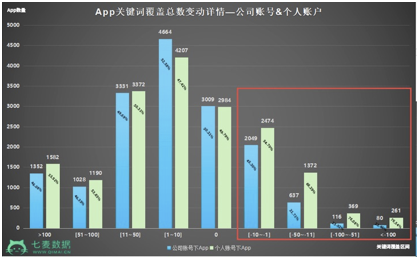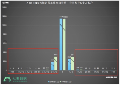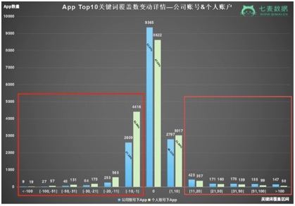 ②从Top3和Top10关键词(cí)总数上来(lái)看:如果大家觉得上图对(duì)比不太明(míng)显(xiǎn),可以看下方(fāng)Top3和(hé)Top10关键词覆盖(gài)总数(shù)变动详情图(tú)。减(jiǎn)少(shǎo)区间(-1以下)中,个人账(zhàng)号下的App数量和公司账号下的App数量对比(bǐ),相差很悬(xuán)殊。