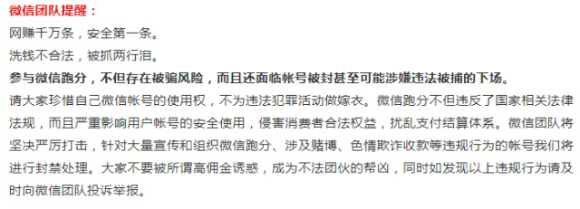 记者(zhě)关注到(dào),腾讯(xùn)支(zhī)付风控团(tuán)队发布《关于打击(jī)“微信跑分” 违法(fǎ)违(wéi)规(guī)活动的公告》(以下简称《公告》)称,微信(xìn)跑分不(bú)但违反了国家相关法(fǎ)律法(fǎ)规,而且严重影响用户账号的安全使用,侵害用户的合法权益,给用户带来押金被骗、信息泄露、为(wéi)违法活动洗钱等(děng)重大风险。