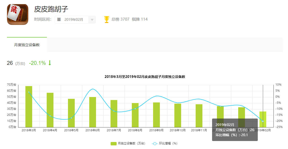 嘉兴乐玩旗下(xià)主力游戏《皮皮跑胡子(zǐ)》月度独立设备数,从2018年3月的68万台下降到2019年2月的26万台。