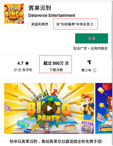 而最关键的指标,《Bingo Party》和《Bingo Blitz》在Google Play上分别在(zài)“创收最高”中排名(míng)第(dì)二(èr)和第三。这是(shì)什么概(gài)念?在GooglePlay上下(xià)载量超(chāo)5000万的《Zynga德州扑克》甚至没进前(qián)十。换句话说,宾果游戏比德(dé)州(zhōu)扑克还赚钱(qián)!另外(wài),据天辰娱乐(hú)了解,还有两款bingo游戏(xì)在Google Play上分别在(zài)“创收最高”中(zhōng)排名第(dì)四和(hé)第七。