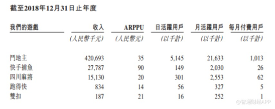 招股书显示(shì),禅游主力(lì)游戏《斗地(dì)主(zhǔ)》去(qù)年收(shōu)入4.21亿,DAU达514.5万(wàn),ARPU为35元;《快手(shǒu)捕鱼》收入2778万元,DAU达14.9万,ARPU为(wéi)90元;《四川麻(má)将》收入1513万(wàn)元,DAU达30.1万,ARPU为20元(yuán)。由(yóu)此可见,禅游科(kē)技去年游戏收(shōu)入在棋牌(pái)游戏收(shōu)入下(xià)滑的(de)情况下,主要是因为《快手捕鱼》这(zhè)款游戏的大爆发(fā)而保持(chí)增长:《快手捕鱼(yú)》去年收入同比(bǐ)暴涨25倍。