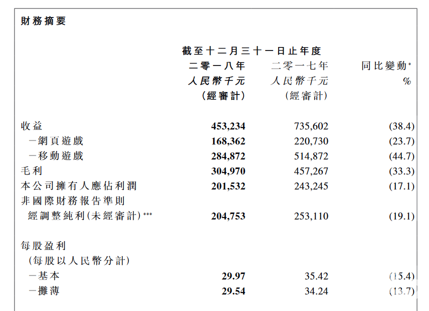 据博雅互动(dòng)年报披露的数据,2018年博雅互(hù)动收入4.53亿元,同比下降38.4%,公司纯利约为2.04亿元,同比减少19.1%。