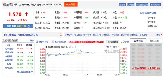 今(jīn)日(rì),棋(qí)牌厂(chǎng)商禅游科技在港交所首次挂(guà)牌交易,发行约1.8亿股,发售价定为(wéi)每(měi)股H股1.23港元,每手(shǒu)2000股。截止到文章发布时间,股价为1.57港(gǎng)元(yuán),涨(zhǎng)幅(fú)高达27.64%,恭喜禅游(yóu)。