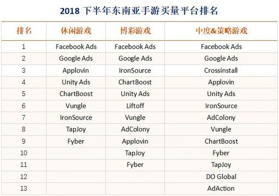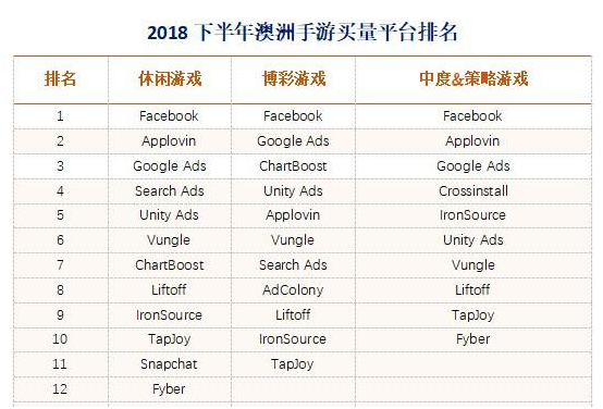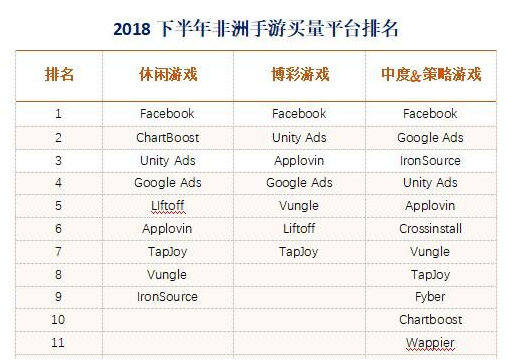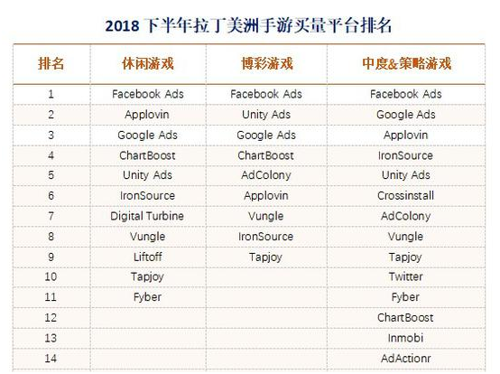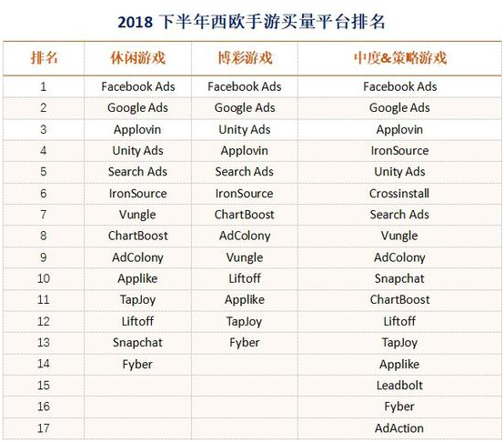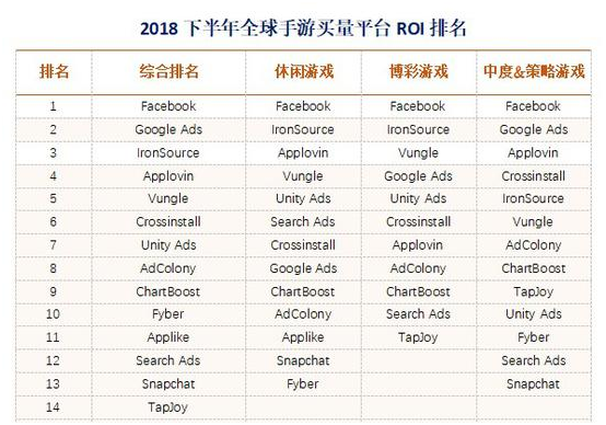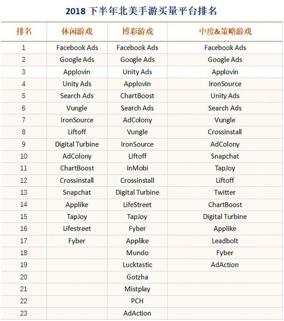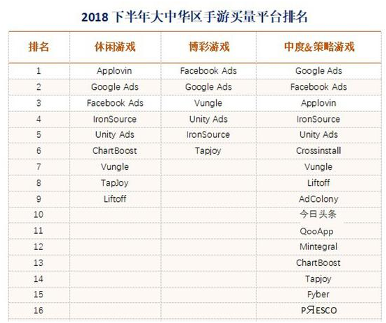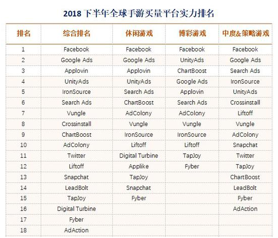 2018下半年大中华地区的博弈类游戏买量(liàng)平台排名前五的分别是(shì)Facebook、谷歌、Vungle、UnityAds和(hé)IronSource。