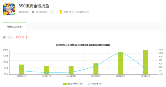 从艾瑞数据提供的(de)数据来看,从去年11月以来,《850棋牌金蟾捕(bǔ)鱼》的月活(huó)增长非常迅速,去年11月,月(yuè)活才7万,到(dào)今年(nián)3月,月活已(yǐ)经突破20万,用(yòng)户增(zēng)长接近200%。