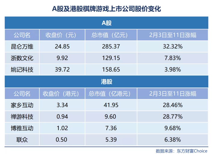 而在港股市场中,股价涨幅最(zuì)大的棋牌公司当属家(jiā)乡互动,从(cóng)2月3日至11日(rì)累(lèi)计上涨(zhǎng)逾28%,截至今日收(shōu)盘报3.49港元每股(gǔ)。此外,禅游科技(上涨28.77%)、博雅互(hù)动(上涨9.68%)以及联(lián)众(上涨6.38%)均出现不同程度的(de)上涨(zhǎng)。