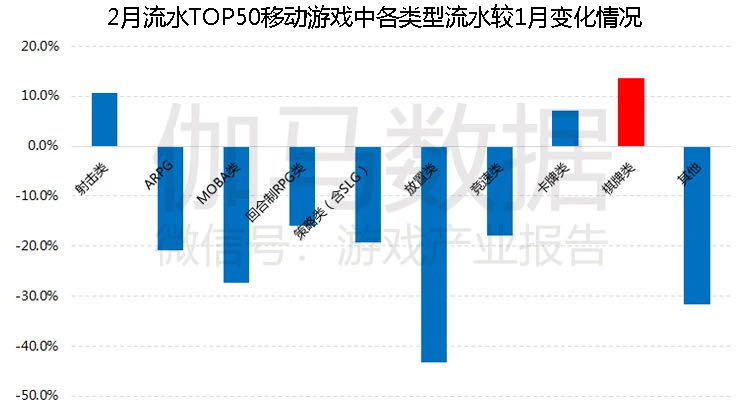 不过,这家权威的游戏研(yán)究机(jī)构也(yě)发布数据称:相比刚刚(gāng)过(guò)去的火爆1月, 2月移动(dòng)游戏市场大多(duō)数(shù)游戏类(lèi)型均(jun1)有(yǒu)着一定程度(dù)的(de)下滑,但棋牌类游戏的流水等相较于1月有明显的(de)增长。