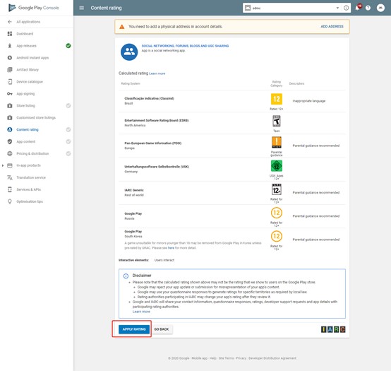 得到 Google 给出的评定(dìng)等级,没有问题后点击应(yīng)用评级(jí)