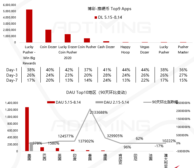 《Lucky Day》是经典的(de)网赚类slots游戏代表(biǎo),有了(le)前浪就必然有后(hòu)浪。发行于2020年3月底的《Lucky Pusher》在(zài)同年4月份就冲上了美国(guó)ioses下载(zǎi)榜单前十(shí),上线3月就(jiù)斩(zhǎn)获了最多流量稳(wěn)居(jū)第一,并(bìng)超(chāo)越了(le)经典推硬(yìng)币游戏《Coin Dozer》。