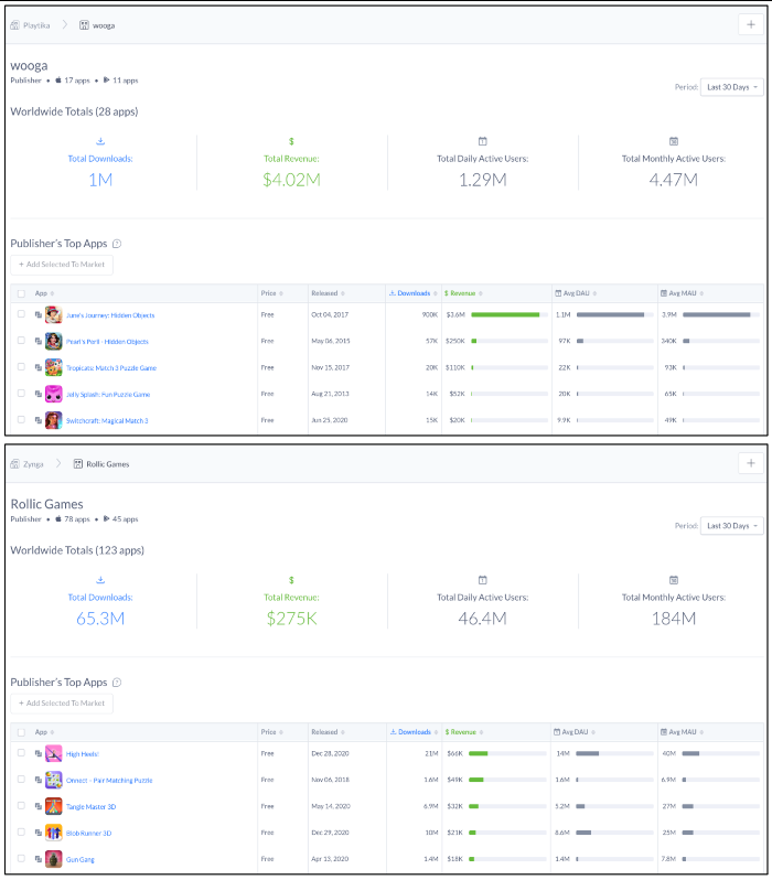 以Playtika、Zynga为例,这两家头部厂商采用了多元化竞争(zhēng)策略,通过(guò)收(shōu)购其他类型的手(shǒu)游公司,扩展(zhǎn)业务范(fàn)围,寻(xún)找更多的增长动力。根据Apptopia中两家厂商的发行图谱(pǔ)来看,Playtika旗下的wooga和Zynga旗下的Rollic