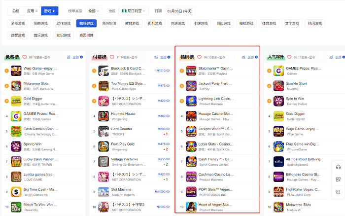 根据尼日利亚的棋牌游戏排(pái)行榜,我(wǒ)们可(kě)以发(fā)现,Casino类、宾果类游戏(xì)在尼日利亚(yà)较为流(liú)行,常见的(de)拉霸游戏(xì)随处可见(jiàn),除(chú)此(cǐ)之外(wài)21点,飞行(háng)棋在(zài)尼日利(lì)亚也比较流行(háng)。